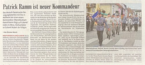Das deutsch-französische Versorgungsbataillon mit Sitz in Müllheim hat einen neuen Kommandeur: Oberstleutnant Patrick Ramm folgt auf Colonel Cédric le Mens. Stellvertreter ist Colonel Hubert de Villepin.