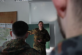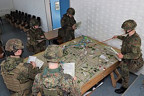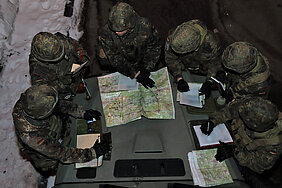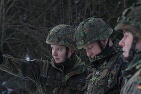 Bei Minusgraden auf der Schwäbischen Alb startet die 3. Batterie des Artilleriebataillons 295 bereits Mitte Januar mit der Vollausbildung. Kompetenzorientiert üben der Gefechtstand sowie Führungspersonal des Geschützzuges und des Feuerunterstützungszuges freilaufend in und um Stetten am kalten Markt. Nach der Weiterbildung „Führungsprozess der Landstreitkräfte“ und der Einweisung in die Ausgangslage am Geländesandkasten gibt der Batteriechef am nächsten Tag im Rahmen einer Befehlsausgabe seine Absicht an die Zugführer und die Erkunder seiner Batterie aus : Feuerstellungsräume für die Panzerhaubitzen 2000 und Beobachtungsstellen erkunden.
