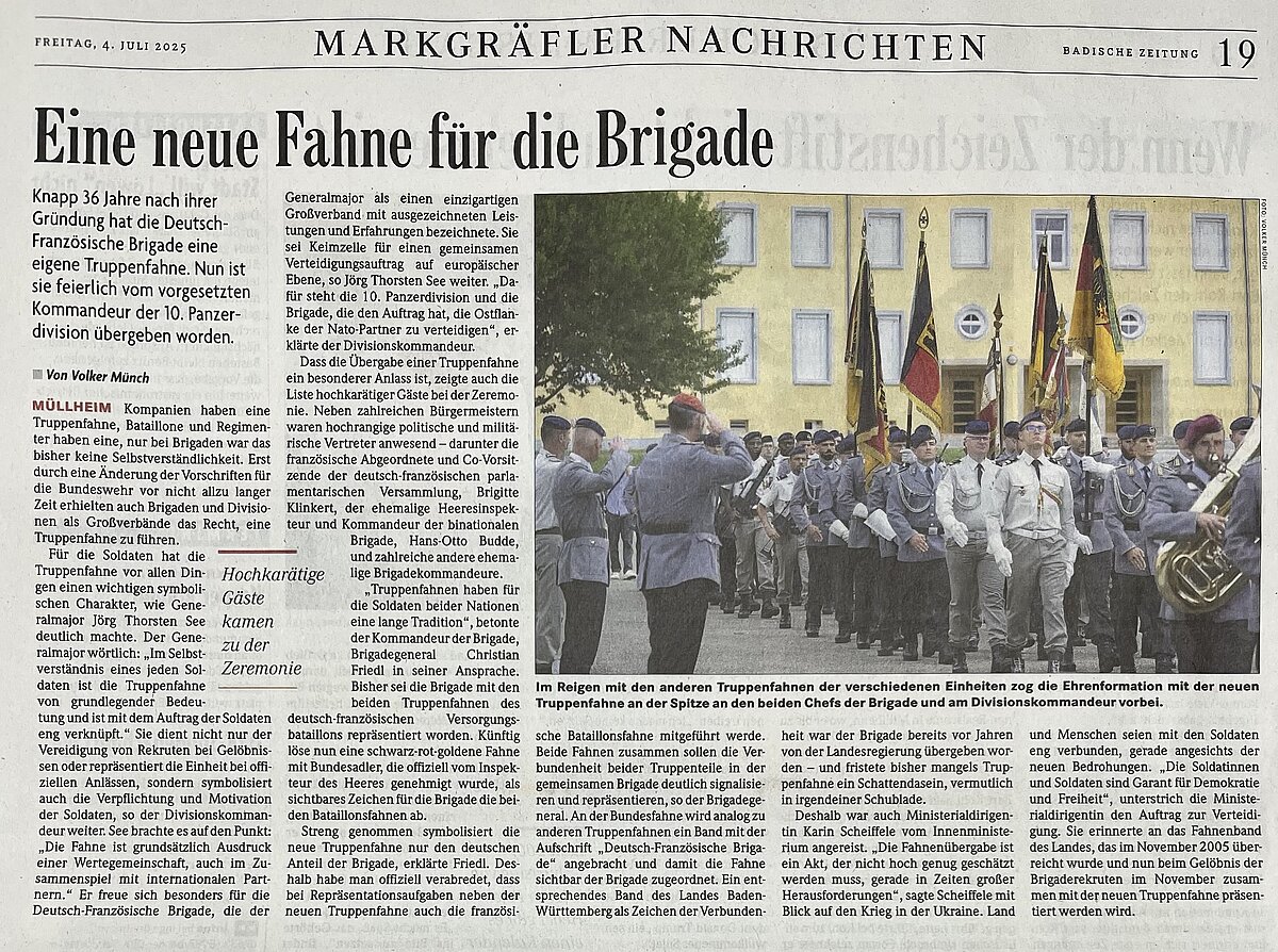 Am 27. Juni erfolgte die feierliche Übergabe der deutschen Truppenfahne und des entsprechenden Fahnenbandes an die Deutsch-Französische Brigade in Müllheim im Markgräflerland.