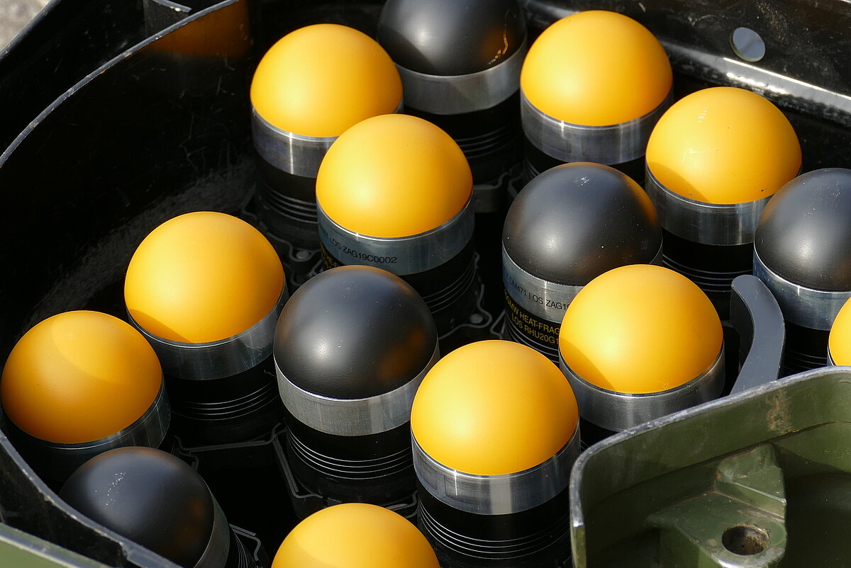 Die 40mm großen Geschosse befinden sich in einem Gurt und werden nach dem Einlegen in die Waffenanlage geschützt „unter Luke“ aus dem Fahrzeug verschossen.