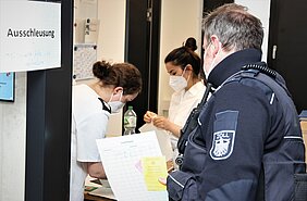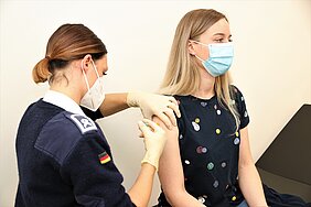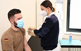 220 Zollbeamte und 50 Soldaten erhielten im Sanitätsversorgungszentrum Müllheim in den vergangenen Tagen ihre erste Corona-Schutzimpfung. Ein wichtiger Schritt zur Bekämpfung der Pandemie. Dank der guten Organisation lief alles reibungslos. „In sechs Wochen ist dann für die Einsatzkräfte des Hauptzollamtes Lörrach und die in der Impfreihenfolge priorisierten oder für den Auslandseinsatz vorgesehenen Soldatinnen und Soldaten der zweite Impftermin geplant“, sagt Stabsfeldwebel Melanie Penz, „Spieß“ im Sanitätsversorgungszentrum. Die Sanitäterinnen und Sanitäter helfen gerne, wo immer sie gebraucht werden. „Wir sind stolz, unseren Beitrag zur Bekämpfung der Pandemie auch in diesem Bereich zu leisten“, erklärt Melanie Penz.