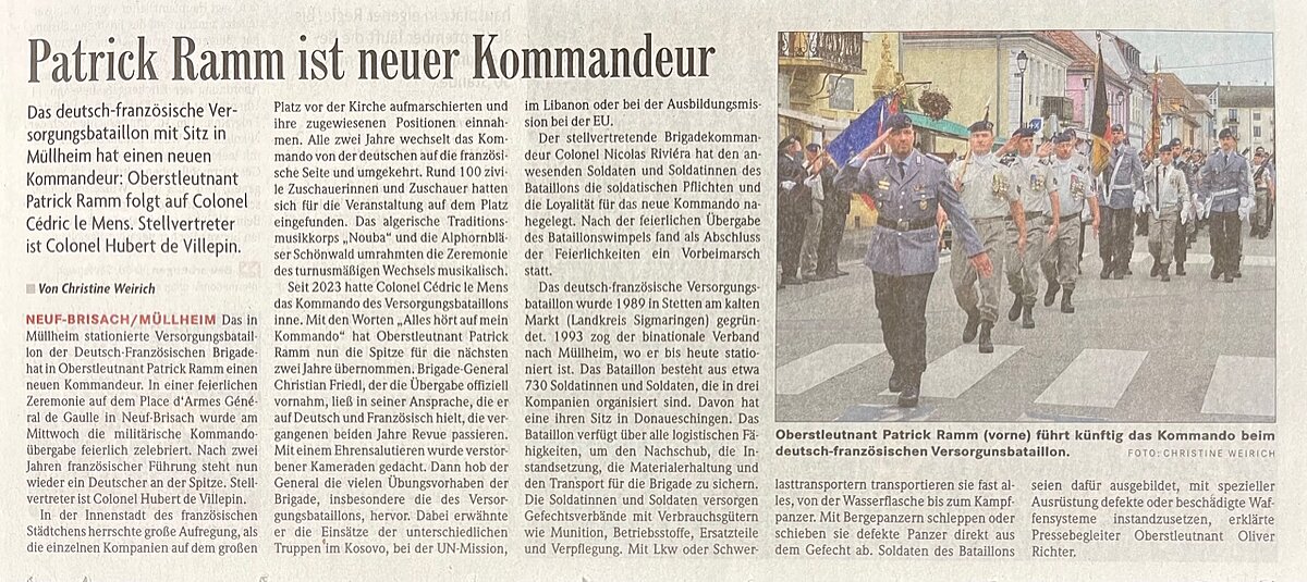 Das deutsch-französische Versorgungsbataillon mit Sitz in Müllheim hat einen neuen Kommandeur: Oberstleutnant Patrick Ramm folgt auf Colonel Cédric le Mens. Stellvertreter ist Colonel Hubert de Villepin.