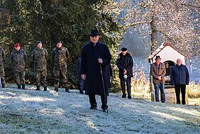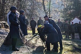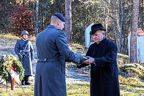 Am Totensonntag haben Angehörige des ArtBtl 295, der Reservistenkameradschaft Stetten am k.M. unter ihrem Vorsitzenden Oberfeldwebel d.R. Widera und Ehemalige der 1993 aufgelösten Panzerbrigade 29 „Südbaden-Hohenzollern“ in einer würdigen Feierstunde den in der Ausübung des Dienstes ums Leben gekommenen Soldaten dieser Brigade gedacht. In Beisein von Generalleutnant a.D. Oerding und Brigadegeneral Kopp sowie dem Organisator der Veranstaltung, Hauptmann a.D. Zimmermann, legten der Kdr des Artbtl 295, Oberstleutnant Freudenberger, und der ehemalige Kommandeur der Panzerbrigade 29 (1982-1986), Generalmajor a.D. Göttelmann am Gedenkstein der Brigade bei der Dreitrittenkapelle in Stetten Kränze nieder. „Die Gedenktafel an der Kapelle, für die die Soldaten damals gesammelt haben, bietet die Möglichkeit, gute Gedanken an gute Kameraden zu haben“, führte Generalmajor a.D. Göttelmann in seiner Rede aus. Im Anschluss überreichte er Oberstleutnant Freudenberger das Gedenkbuch mit den Namen der 147 Toten, die zwischen 1959 und 1992 in der Ausübung des Dienstes ums Leben kamen. Darüber hinaus dankte Generalmajor a.D. Göttelmann dem Kdr, dass das ArtBtl 295, das als Panzerartilleriebataillon 295 einmal zur Panzerbrigade 29 gehörte, die Gedenkstätte in seine Obhut nimmt und weiterhin die Erinnerung an diese Brigade pflegt und wachhält.