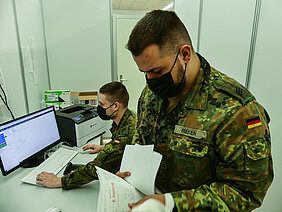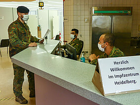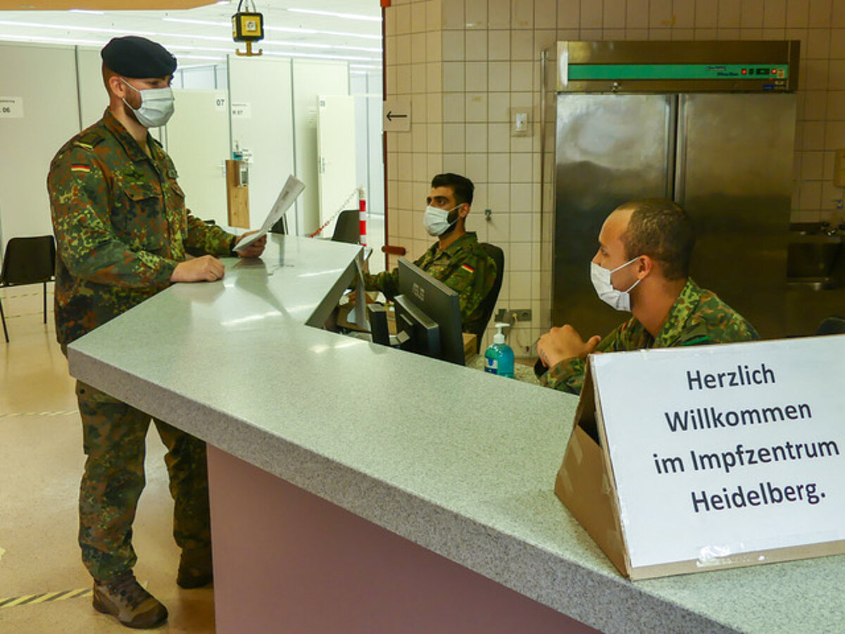 Seit dem 16. September sind acht Soldatinnen und Soldaten der Deutsch-Französischen Brigade wieder in der Amtshilfe in Heidelberg – weitere Kräfte in ganz Baden-Württemberg – im Einsatz. Im Kampf gegen das Corona-Virus unterstützen die Angehörigen unseres Stabes und unserer Stabs- und Fernmeldekompanie aus Müllheim das Zentrale Impfzentrum bei der Registrierung, Sichtung und Prüfung der Unterlagen der zu impfenden Bürgerinnen und Bürger. Für die Soldaten gewohnte Abläufe. Es läuft wie am Schnürchen. „Wir alle waren schon in der Amtshilfe eingesetzt, da weiß jeder was zu tun ist“, sagt Stabsunteroffizier Max Frien, „ein eingespieltes, tolles Team.“