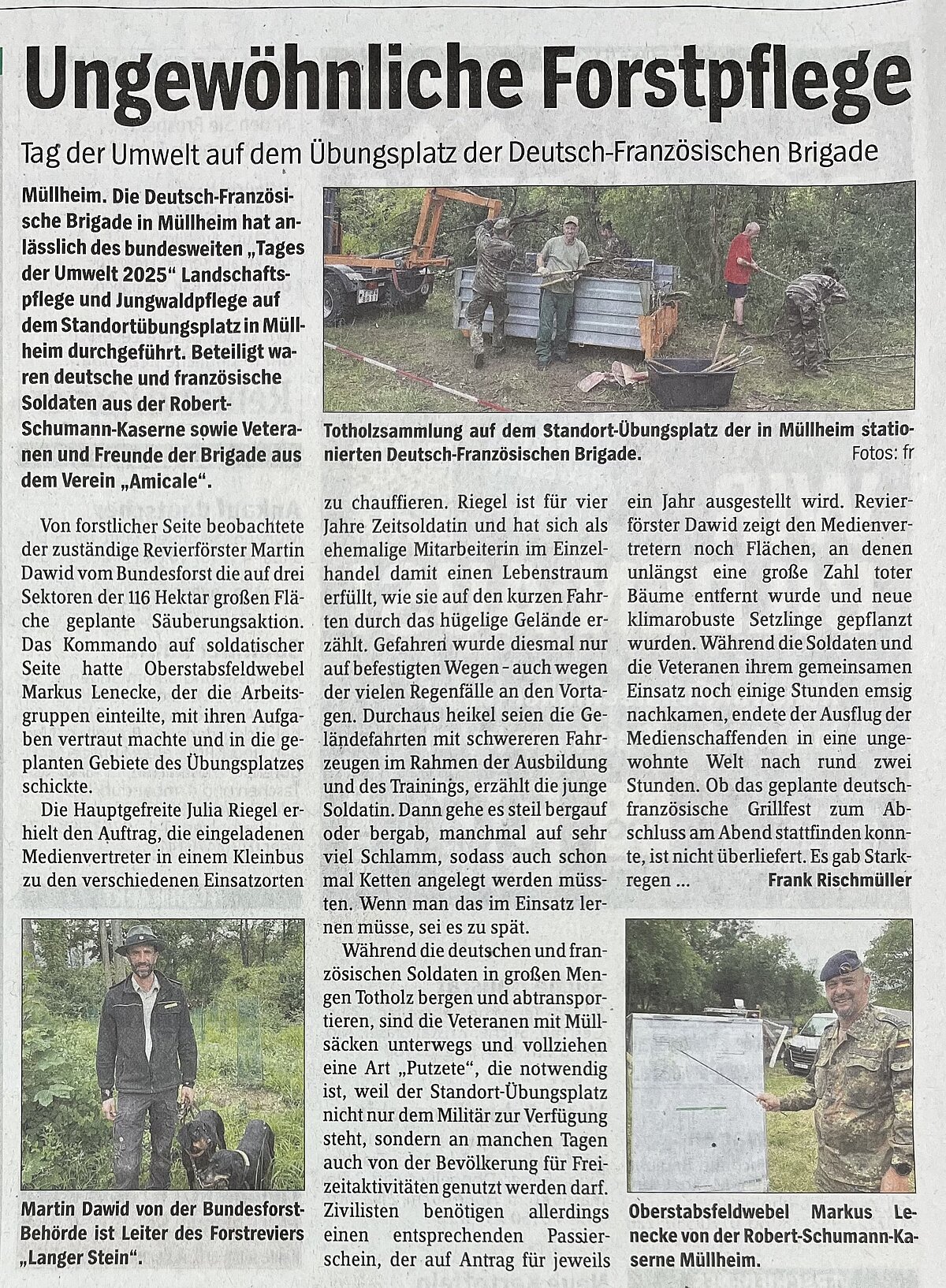 Die Deutsch-Französische Brigade in Müllheim hat anlässlich des bundesweiten „Tages der Umwelt 2025" Landschaftspflege und Jungwaldpflege auf dem Standortübungsplatz in Müllheim durchgeführt. Beteiligt waren deutsche und französische Soldaten aus der Robert-Schumann-Kaserne sowie Veteranen und Freunde der Brigade aus dem Verein „Amicale"